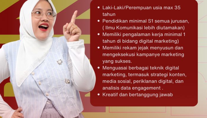 - Pengalaman: Memiliki pengalaman kerja minimal 1 tahun di bidang digital marketing.