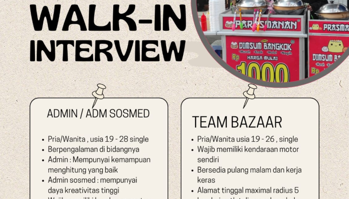 Apakah Anda pribadi yang dinamis, jujur, dan memiliki etos kerja tinggi? Dimsum Bangkok, salah satu penyedia kuliner dimsum populer di Tasikmalaya, sedang membuka kesempatan karir bagi Anda melalui program Walk-In Interview. Kami mencari talenta-talenta muda yang siap berkembang bersama tim kami untuk menempati posisi strategis di kantor pusat maupun operasional lapangan.