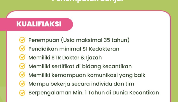 Mencari lowongan kerja Dokter di Banjar, Jawa Barat, dengan fokus pada dunia kecantikan? Al Amin Skincare, klinik kecantikan dengan label Halal Terpercaya, membuka kesempatan karir bagi Anda, Dokter wanita yang profesional dan bersemangat, untuk bergabung sebagai Dokter di klinik kami. Jika Anda memiliki STR aktif, sertifikat di bidang kecantikan, dan siap bekerja dalam tim yang solid, inilah saatnya Anda berkontribusi. Simak detail lengkap loker Dokter Banjar terbaru 2025 ini dan kirimkan lamaran Anda segera!