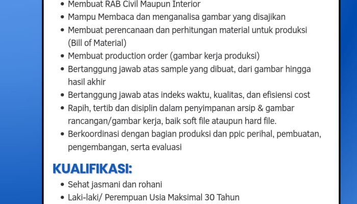 - Pendidikan: Lulusan minimal SMK Teknik Sipil atau Teknik Arsitektur.
