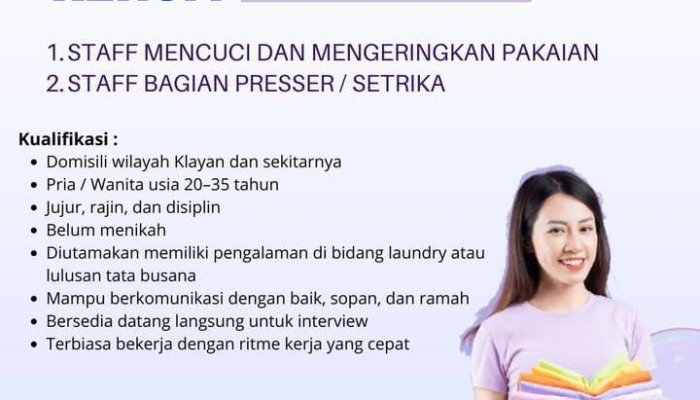 • Pengalaman: Diutamakan memiliki pengalaman di bidang laundry atau merupakan lulusan Tata Busana.