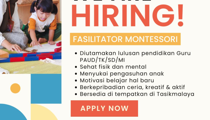 Teman Ibu membuka kesempatan emas bagi Anda yang berjiwa pendidik untuk bergabung sebagai Fasilitator Montessori. Kami mencari lulusan pendidikan Guru PAUD/TK/SD/MI yang siap membentuk masa depan cerah anak-anak di Tasikmalaya. Jika Anda sehat fisik dan mental, menyukai pengasuhan anak, dan memiliki motivasi belajar hal baru, ini adalah kesempatan Anda! Segera daftar loker Fasilitator Montessori Tasikmalaya terbaru ini.