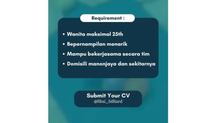 Fiksi Billiard membuka kesempatan kerja untuk kamu wanita muda yang energik, menarik, dan siap bekerja dalam tim. Jika kamu berdomisili di Manonjaya dan sekitarnya, jangan lewatkan peluang ini!