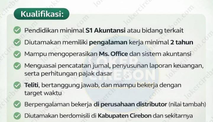Lokasi Kerja: Kabupaten Cirebon, Jawa Barat. Deadline Lamaran: Segera (Lowongan akan ditutup jika posisi sudah terpenuhi).