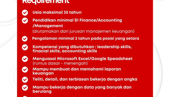 - Pendidikan: Minimal lulusan S1 Finance / Accounting / Management (diutamakan dari jurusan Manajemen Keuangan).