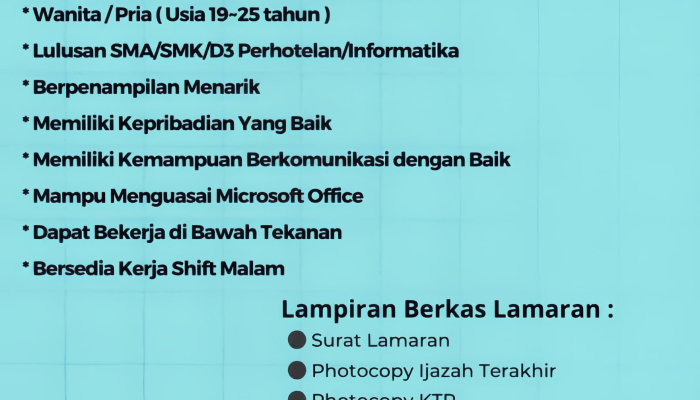 - Pendidikan minimal SMA/SMK/D3 jurusan Perhotelan atau Informatika.