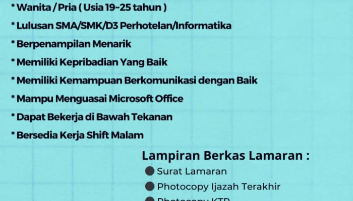 - Pendidikan: Lulusan SMA/SMK/D3 bidang Perhotelan atau Informatika.