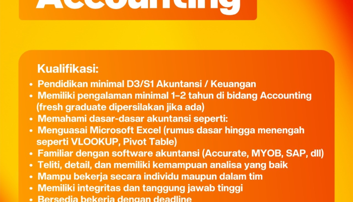- Accounting: Minimal D3/S1 Akuntansi, menguasai Excel (VLOOKUP/Pivot), dan familiar dengan software akuntansi (Accurate/MYOB).