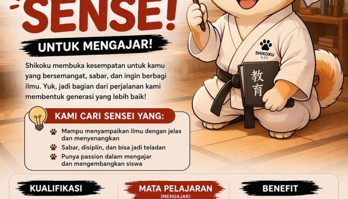 Apakah Anda memiliki kemampuan bahasa Jepang yang mumpuni dan memiliki passion dalam dunia mengajar? PT Shikoku Japan Center sedang mencari sosok “Sensei” yang bersemangat, sabar, dan ingin berbagi ilmu untuk bergabung dalam perjalanan kami membentuk generasi yang lebih baik.