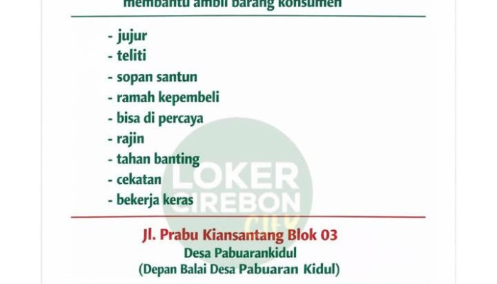 Apakah Anda pria yang jujur, cekatan, dan sedang mencari pekerjaan di area Cirebon? Toko Maju Jaya, pusat grosir snack dan minuman terkemuka di wilayah Pabuaran, sedang membuka kesempatan bagi Anda untuk bergabung sebagai Karyawan Laki-laki (Helper). Kami mencari individu yang memiliki etos kerja tinggi untuk membantu kelancaran operasional toko kami.