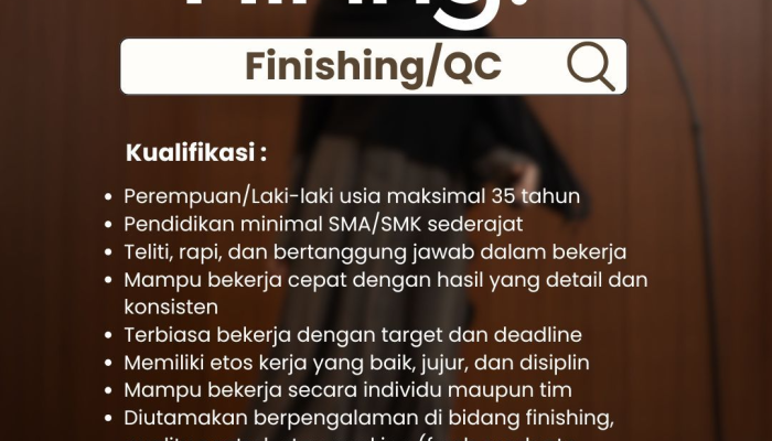 - Nilai Tambah: Diutamakan yang memiliki pengalaman di bidang finishing, QC, atau packing (namun Fresh Graduate tetap dipersilakan melamar).