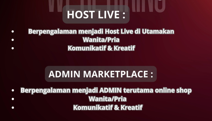 • Host Live: Diutamakan memiliki pengalaman sebagai Host Live sebelumnya.