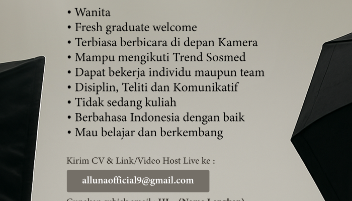 Apakah Anda seorang wanita yang percaya diri, fasih berbicara di depan kamera, dan selalu up-to-date dengan tren media sosial terbaru? Alluna Official membuka kesempatan emas bagi Anda untuk menjadi Host Live kami! Ini adalah peluang sempurna bagi fresh graduate yang ingin berkarir di dunia e-commerce dan live streaming.