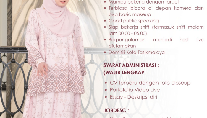 Apakah Anda seorang wanita yang percaya diri di depan kamera dan memiliki kemampuan komunikasi yang persuasif? Amily, brand fashion yang sedang berkembang, memberikan kesempatan emas bagi Anda untuk bergabung sebagai Host Live. Jika Anda berdomisili di Kota Tasikmalaya dan ingin berkarir di industri kreatif e-commerce, ini adalah peluang yang tidak boleh Anda lewatkan!
