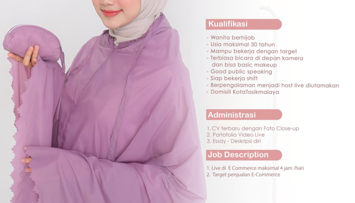 Halo para Job Seeker yang energik dan percaya diri! Apakah Anda memiliki skill public speaking yang memukau dan bersemangat untuk menjadi bintang di dunia E-Commerce? Aliev Official membuka kesempatan emas bagi Anda untuk bergabung sebagai Host Live Freelancer di Tasikmalaya. Ini adalah peluang terbaik untuk Anda yang ingin bekerja secara fleksibel, memiliki penghasilan menarik, dan berdomisili di Kota Tasikmalaya. Mari wujudkan potensi Anda dan raih karir yang cemerlang bersama kami!