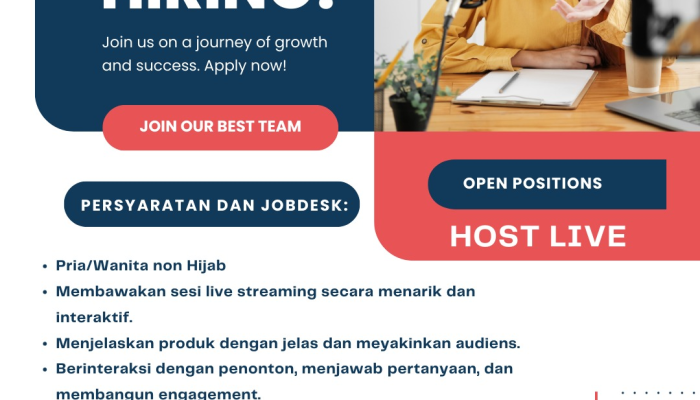 Saat ini kami sedang mencari talenta terbaik untuk mengisi posisi sebagai HOST LIVE. Jika Anda adalah seorang yang suka berekspresi, interaktif, dan siap untuk bertumbuh bersama dalam sebuah tim yang solid, maka inilah kesempatan Anda.
