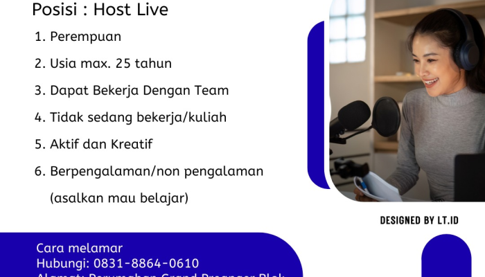 HIH Creative Studio saat ini membuka kesempatan bagi kamu yang berjiwa aktif, kreatif, dan percaya diri untuk bergabung bersama tim kami sebagai Host Live. Posisi ini sangat cocok untuk kamu yang ingin mengembangkan potensi diri di dunia kreatif digital, meskipun belum memiliki pengalaman sebelumnya.