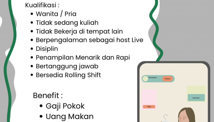 Apakah Anda seorang yang komunikatif, percaya diri di depan kamera, dan mencari peluang karier di dunia digital yang sedang berkembang pesat? Saat ini, peluang emas sedang terbuka bagi Anda yang ingin bergabung sebagai Host Live Streaming untuk penempatan di wilayah Indihiang, Tasikmalaya. Jangan lewatkan kesempatan untuk menyalurkan bakat komunikasi Anda dan meraih penghasilan menarik di industri e-commerce.