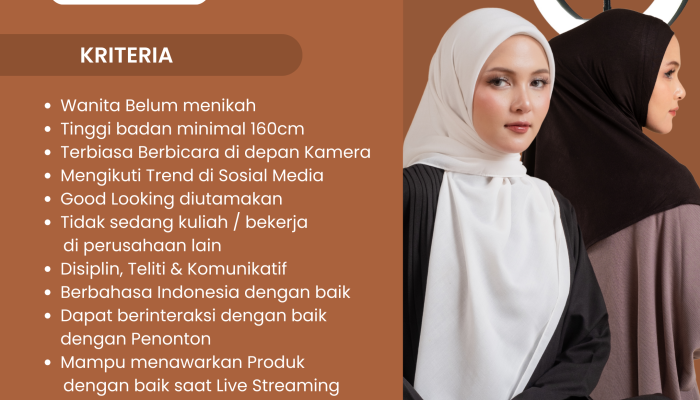 Apakah Anda seorang wanita yang bersemangat, percaya diri, dan suka tampil di depan kamera? Ingin berkarier di dunia fashion muslim dan e-commerce? Maazalat.id sedang mencari Host Live berbakat untuk bergabung dengan tim kami. Jika Anda memiliki kemampuan komunikasi yang baik dan siap menjadi brand ambassador di depan layar, ini adalah kesempatan emas untuk Anda!