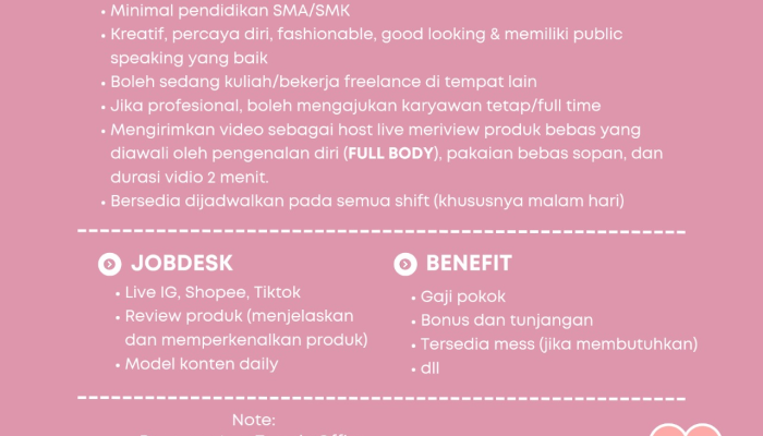 Peluang ini sangat terbuka bagi Anda yang ingin menyalurkan bakat di bidang public speaking dan konten digital. Baik Anda seorang mahasiswa maupun pekerja lepas, Tweely memberikan ruang bagi Anda untuk berkembang menjadi talenta profesional di dunia live streaming e-commerce.