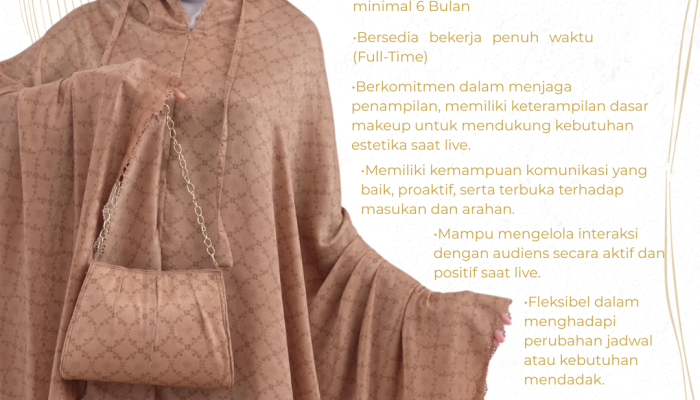 Apakah Anda seorang live host berpengalaman yang punya passion di dunia fashion muslimah? MEDINA, sebuah merek terkemuka, sedang mencari individu berbakat seperti Anda untuk bergabung sebagai Host Live! Jika Anda memiliki kemampuan komunikasi yang persuasif, interaktif, dan bersemangat untuk mempromosikan produk secara langsung, ini adalah kesempatan emas untuk Anda. Bergabunglah bersama kami dan bantu membangun audiens setia serta meningkatkan penjualan melalui sesi live streaming yang menarik dan tak terlupakan.