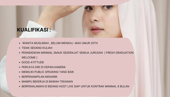 Untuk dapat melamar loker Host Live Hijab & Mukena Tasikmalaya ini, Anda harus memenuhi persyaratan ketat berikut: