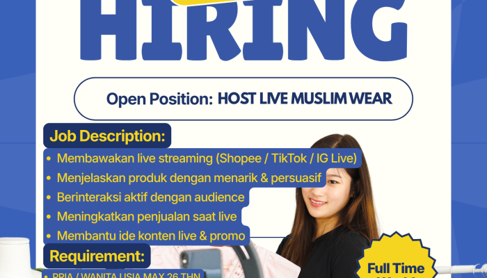 Lowongan Kerja Host Live Muslim Wear 2026 – Apakah Anda pribadi yang energik, percaya diri di depan kamera, dan mahir berkomunikasi? Kami sedang mencari talenta berbakat untuk bergabung sebagai Host Live Muslim Wear. Jika Anda ingin berkarir di dunia e-commerce yang dinamis dan berkembang pesat, inilah kesempatan emas untuk Anda!