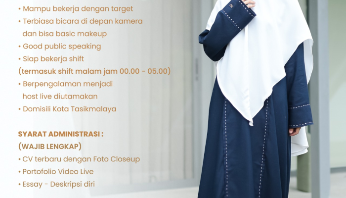 Apakah Anda seorang wanita berhijab yang percaya diri di depan kamera dan memiliki kemampuan komunikasi yang baik? NAJ Studio sedang membuka kesempatan emas bagi Anda untuk bergabung sebagai Host Live profesional di Kota Tasikmalaya.