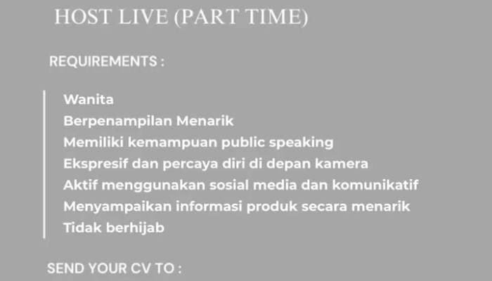 - Menjadi pembawa acara saat siaran langsung (live streaming) di platform media sosial seperti TikTok, Instagram, atau Shopee Live.