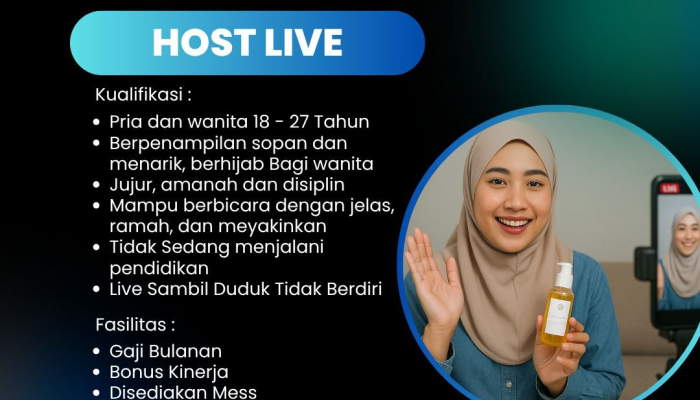 Apakah Anda pribadi yang enerjik, percaya diri, dan memiliki kemampuan komunikasi yang luar biasa? Inilah kesempatan Anda untuk membangun karir cemerlang sebagai Host Live di pusat operasional live commerce kami di Tasikmalaya!