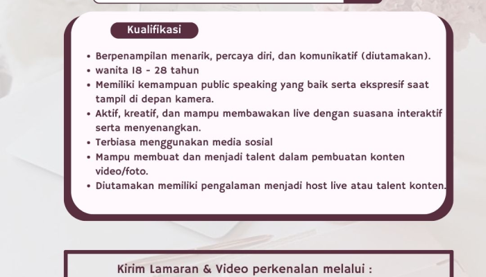 • Diutamakan memiliki pengalaman sebagai host live atau talent konten
