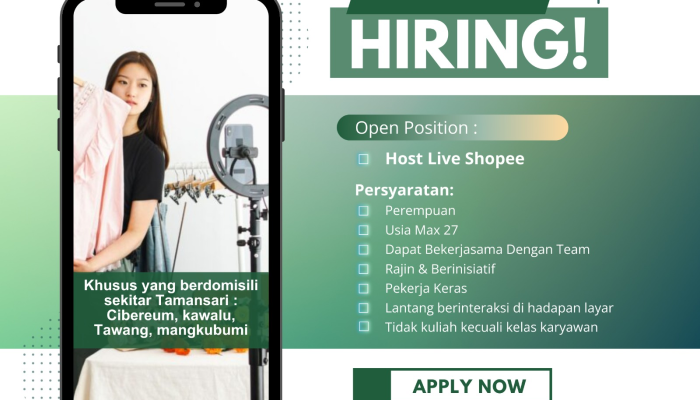 Apakah Anda seorang wanita yang komunikatif, percaya diri di depan kamera, dan berdomisili di Tasikmalaya? ADVANTA sedang membuka kesempatan karir menarik bagi Anda untuk bergabung sebagai Host Live Shopee.