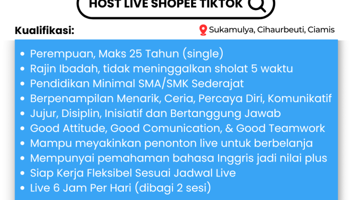 Berikut adalah kriteria yang kami cari untuk posisi Host Live: