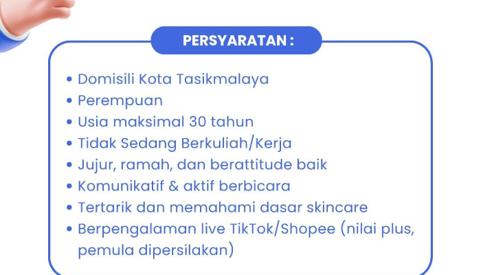 Apakah Anda seorang perempuan yang komunikatif, percaya diri di depan kamera, dan memiliki ketertarikan besar di dunia kecantikan? Peluang karir menarik kini hadir di Kota Tasikmalaya! Kami sedang mencari talenta berbakat untuk bergabung sebagai Host Live Skincare guna mempromosikan produk-produk perawatan kulit unggulan melalui platform live streaming.