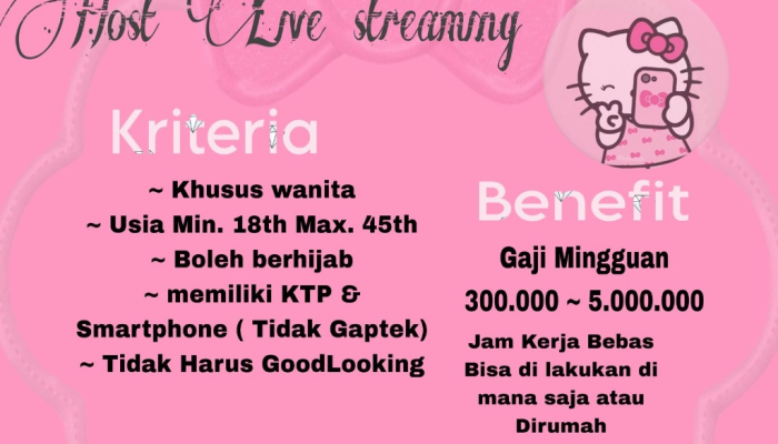 Apakah Anda mencari pekerjaan dengan waktu yang fleksibel dan penghasilan mingguan yang menjanjikan? Agency Kitty, di bawah naungan Arini Chintya, sedang membuka kesempatan bagi Anda untuk bergabung sebagai Host Live Streaming. Lowongan ini sangat cocok bagi Anda yang ingin bekerja tanpa terikat kantor, karena posisi ini bisa dilakukan dari mana saja, termasuk dari rumah Anda sendiri.