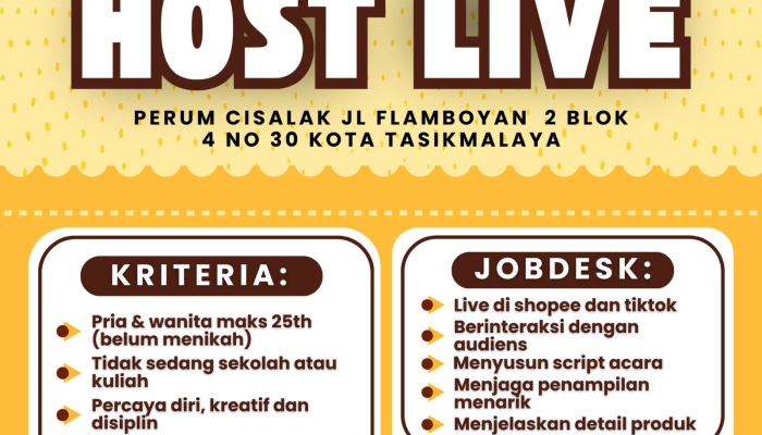 Apakah Anda pribadi yang percaya diri, kreatif, dan mahir berkomunikasi di depan kamera? Agisherbal, unit usaha yang berbasis di Kota Tasikmalaya, saat ini sedang membuka kesempatan karir (Open Recruitment) untuk posisi Host Live Streaming.