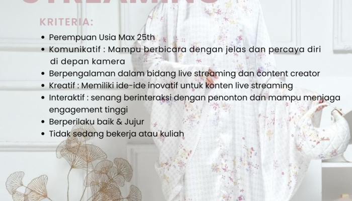Jika Anda tidak sedang terikat pekerjaan atau kuliah, memiliki ide-ide inovatif, dan siap menjadi wajah utama brand mukena ternama, segera kirimkan lamaran Anda! Jangan lewatkan kesempatan karir Host Live Streaming 2025 ini!