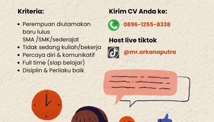 Apakah Anda seorang wanita yang percaya diri, komunikatif, dan punya semangat belajar tinggi? Jika ya, ada kesempatan menarik untuk Anda! Kami sedang mencari Host Live Streaming untuk mempromosikan produk baju anak-anak. Jika Anda baru lulus dan ingin memulai karir di dunia live streaming, ini adalah kesempatan emas untuk Anda!