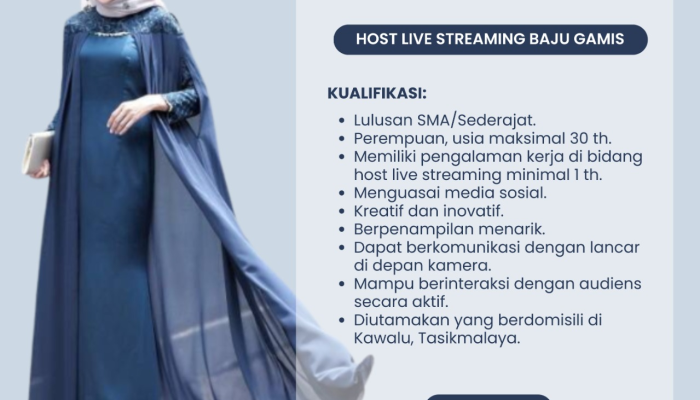 Apakah Anda seorang wanita yang kreatif, inovatif, dan memiliki kemampuan berbicara yang memukau di depan kamera? Apakah Anda memiliki passion di dunia fashion Muslim, khususnya baju gamis? Jika jawabannya ya, ini adalah kesempatan emas yang tidak boleh Anda lewatkan! Kami mencari talenta terbaik untuk bergabung sebagai Host Live Streaming Baju Gamis yang berdomisili di Kawalu, Tasikmalaya.