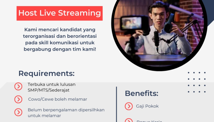 Apakah Anda pribadi yang percaya diri di depan kamera dan memiliki kemampuan komunikasi yang baik? Ini adalah kesempatan emas bagi Anda! A PLUS Company saat ini sedang membuka kesempatan karir bagi talenta muda yang dinamis untuk bergabung bersama tim kami sebagai Host Live Streaming.