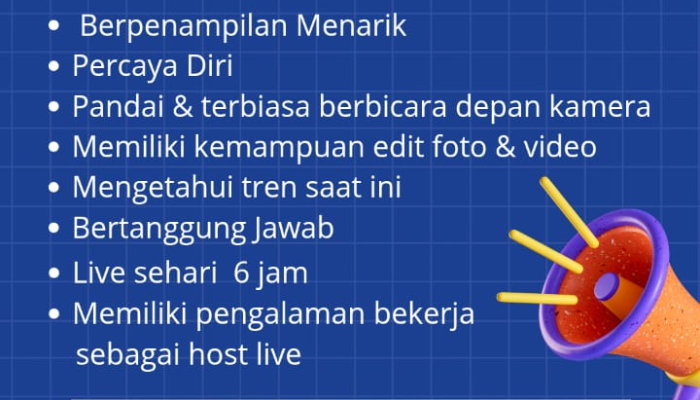 - Pengalaman: Diutamakan bagi yang memiliki pengalaman kerja sebelumnya sebagai Host Live.