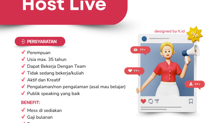 Apakah Anda seorang wanita yang aktif, kreatif, dan memiliki kemampuan berbicara di depan umum yang memukau? HIH Creative Studio saat ini sedang mencari bakat-bakat baru untuk bergabung sebagai Host Live profesional. Kami mengundang Anda yang bersemangat untuk berkarir di industri kreatif digital dan siap menjadi wajah dari berbagai konten menarik kami.