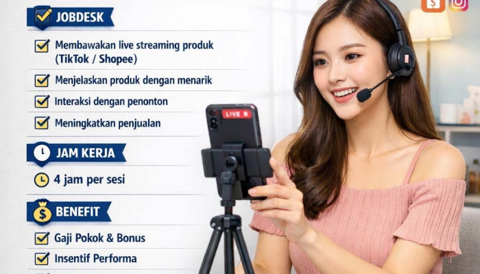 Apakah Anda pribadi yang percaya diri, komunikatif, dan senang berinteraksi di depan kamera? Ini adalah kesempatan Anda untuk bergabung dalam industri yang sedang tren! Kami sedang membuka lowongan kerja untuk posisi Host Live Streaming secara penuh waktu (fulltime) untuk ditempatkan di Kota Tasikmalaya.