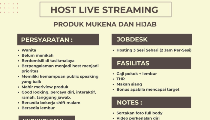 Apakah Anda seorang wanita yang penuh percaya diri, ramah, dan mahir berbicara di depan kamera? Jika ya, ini adalah kesempatan emas untuk Anda! Kami mencari Host Live Streaming yang bersemangat untuk mempromosikan produk mukena dan hijab. Jadilah wajah dari merek kami dan bantu kami menjangkau audiens yang lebih luas.