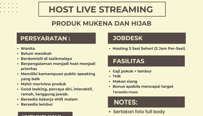 Apakah Anda memiliki bakat dalam berbicara di depan kamera, berpenampilan menarik, dan ingin membangun karir sebagai host live streaming? Sebuah perusahaan di Tasikmalaya yang bergerak di bidang produk fashion muslim (mukena dan hijab) membuka kesempatan emas bagi Anda untuk bergabung sebagai Host Live Streaming. Ini adalah peluang ideal bagi Anda yang interaktif, percaya diri, dan siap bekerja dengan target.