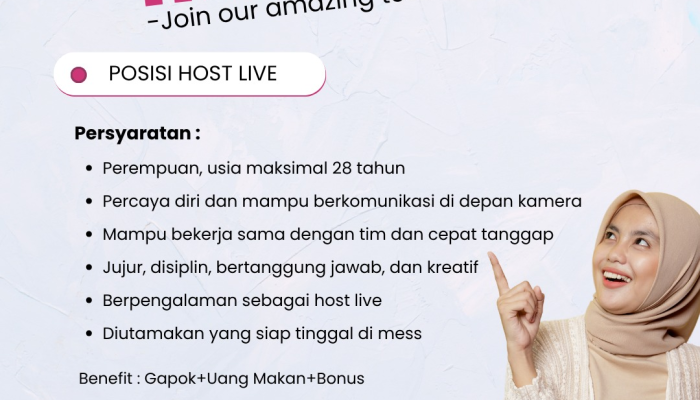 TIM DILAMUKENA membuka kesempatan untuk kamu yang percaya diri dan suka tampil di depan kamera! Kami sedang mencari Host Live yang energik dan komunikatif untuk memperkuat tim live streaming kami.