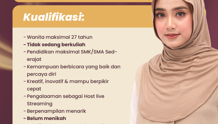 Apakah Anda seorang wanita yang percaya diri di depan kamera, kreatif, dan memiliki pengalaman sebagai Host Live Streaming? Ini adalah kesempatan emas bagi Anda untuk bergabung dengan YourA Hijab, di bawah naungan CV ALB MUSLIM INDUSTRI, sebagai Host Live profesional. Jika Anda familiar dengan tren populer dan siap menjadi wajah brand hijab yang sedang berkembang, segera siapkan CV dan video perkenalan Anda!