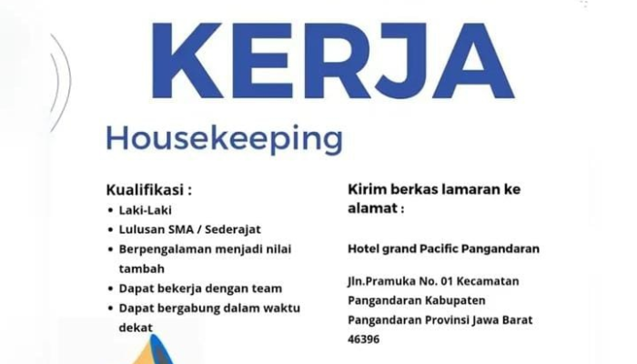 Loker Pangandaran Terbaru 2026 – Apakah Anda seorang pria yang disiplin, rapi, dan memiliki minat berkarir di industri perhotelan? Grand Pacific Hotel Pangandaran, salah satu akomodasi terkemuka di kawasan wisata Pangandaran, saat ini sedang membuka kesempatan kerja bagi Anda untuk mengisi posisi Housekeeping.