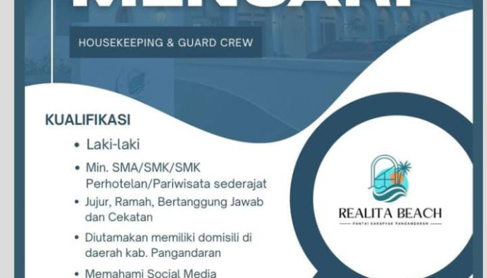 Apakah Anda pribadi yang jujur, cekatan, dan ingin berkarir di industri perhotelan yang sedang berkembang? Realita Beach, destinasi penginapan populer di kawasan Pantai Karapyak, saat ini sedang mencari individu berbakat untuk bergabung dalam tim operasional kami sebagai Housekeeping & Guard Crew.
