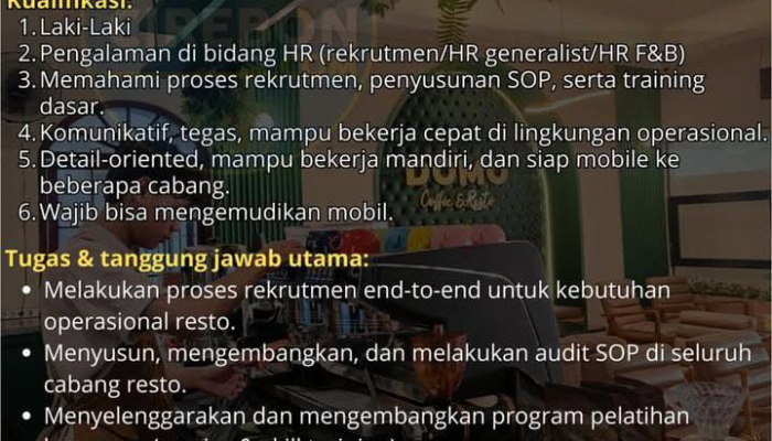 Apakah Anda seorang profesional HR yang berpengalaman, detail-oriented, dan menyukai tantangan di lingkungan restauran dan F&B? DOMO ID Coffee & Resto membuka peluang karir untuk posisi HRD (Human Resources Department). Kami mencari individu yang mampu melakukan rekrutmen end-to-end, menyusun SOP, dan menyelenggarakan program pelatihan untuk seluruh cabang resto.